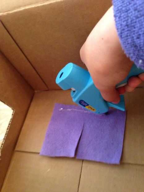 En primer lugar, deberás cortar una puerta con el cortador de la caja y hágale un agujero donde desea que su timbre de puerta. Entonces puedes recortar la ventana y añadir fieltro para la cortina.