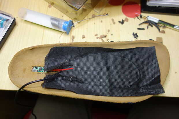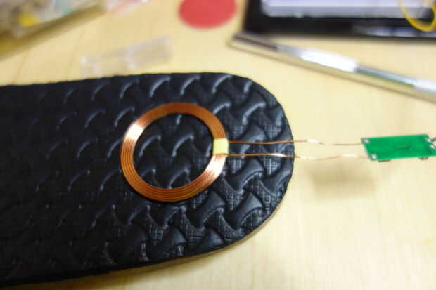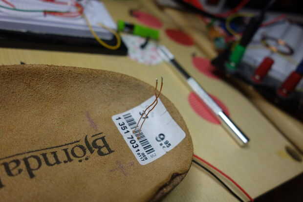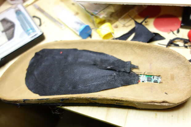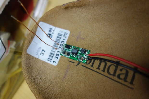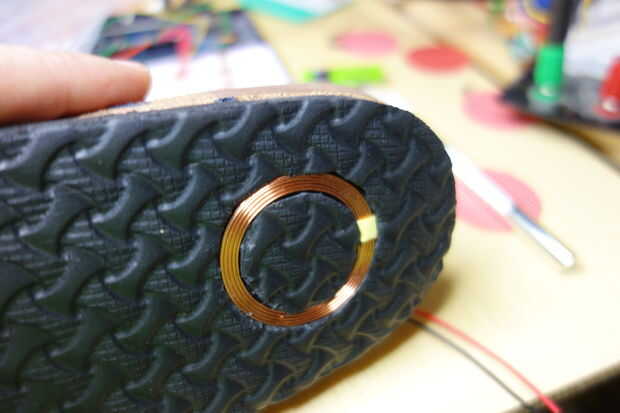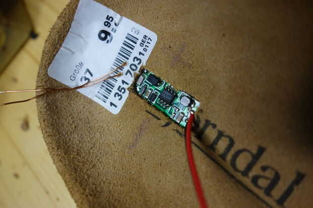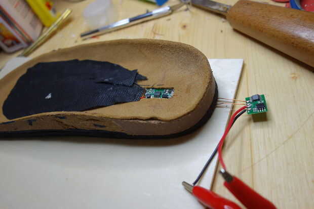 Desoldar la bobina de la pcb, inserte la bobina inot la planta del pie, insertar el ic en el otro lado de la suela y los cables de soldadura en (hice dos cortes, por lo que podría empujar los cables en la planta del pie, para que sean completamente invisibles).