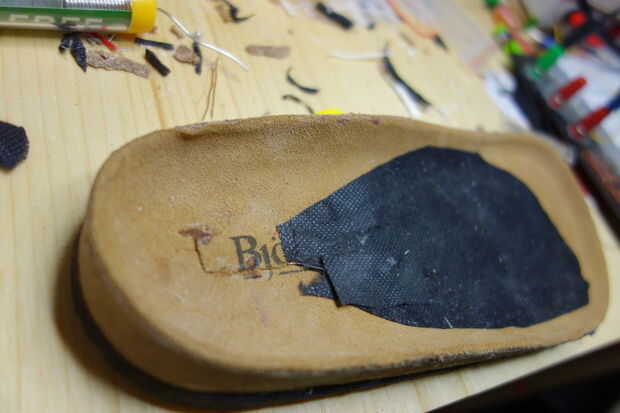 En el interior de la suela corte rectangular en su totalidad en el tamaño del PCB para el rectificador. Que sea tan profundo como sea posible, para que el usuario no sienta al caminar.