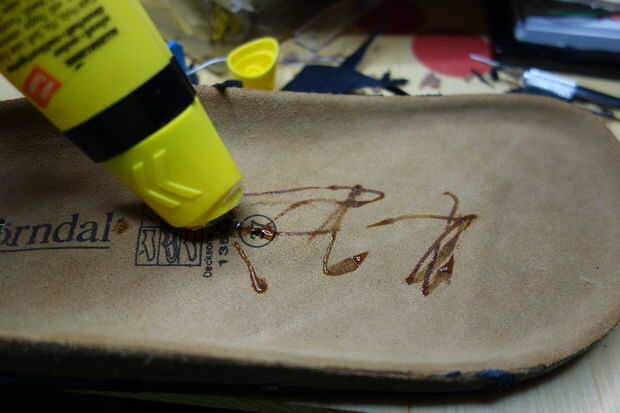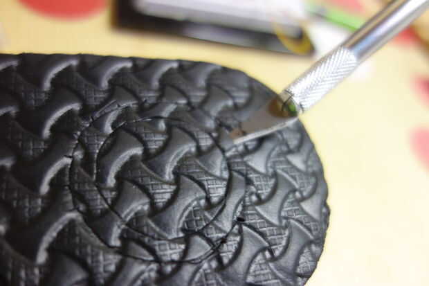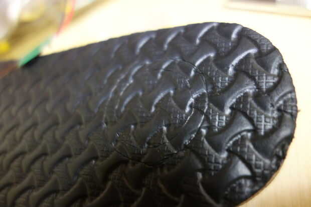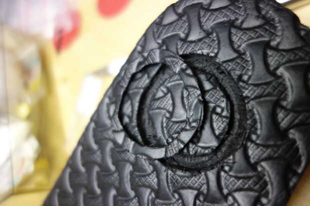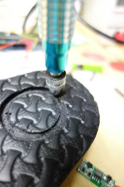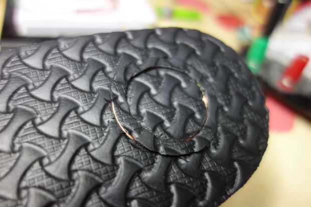A continuación cortar un un círculo profundo de aproximadamente 3mm de la suela en el talón. Debe tener el tamaño de la bobina de inducción. No lo hacen demasiado profundo, porque el la potencia va a sufrir mucho si la distancia se hace más grande!
