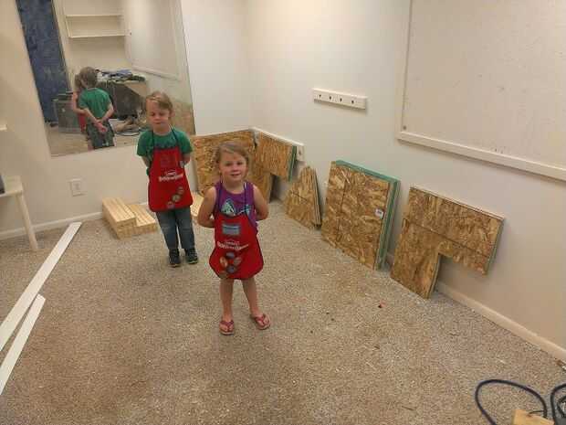 Lo principal para esta escala de estructura es que puede hacer cada cubo por sí mismo si es necesario, pero para montarlos juntos en un arreglo de discos, usted necesita ayuda. Pero voy a en eso más adelante. Tuve un 3 y un 6 años ayudarme, así que uso como una medida para cuánto ayuda que necesita. Coloque todas las piezas que necesitará en un arreglo ordenado, para que tus ayudantes pueden ayudar a derecha. Hacer el corte con seguridad, con seguridad PPE y no hay niños alrededor. Corte de más de un cubo es útil usar las abrazaderas en C. Sujete juntas múltiples juntos para asegurarse de que son todo uniformes después del corte. He utilizado una sierra de sable. tableros de 3 es más rápido, pero 6 era posible. He pagado es para cortar las láminas de OSB en 2' plazas porque no tengo un carro disponible. Y era del tamaño que necesitaba para más cortes. Los paneles de falso suelo triangulares tuvo algo de creatividad, pero lo hice funcionar con un poco trigonometría y una sierra de sable. Una vez más, el patrón está en PDF.