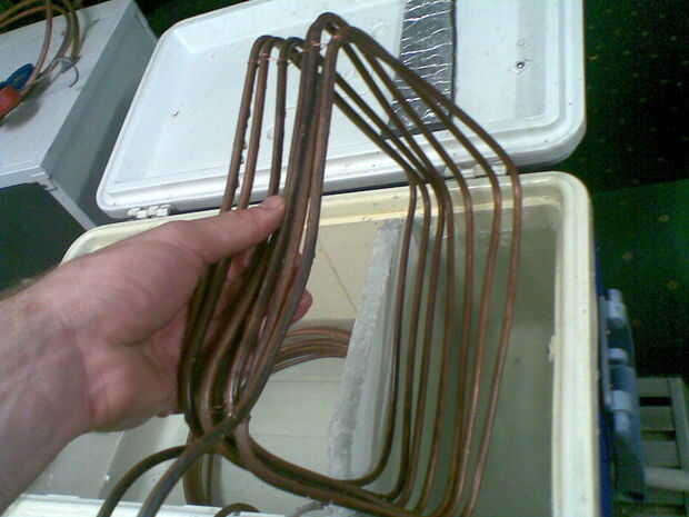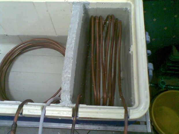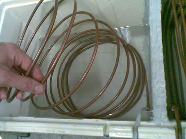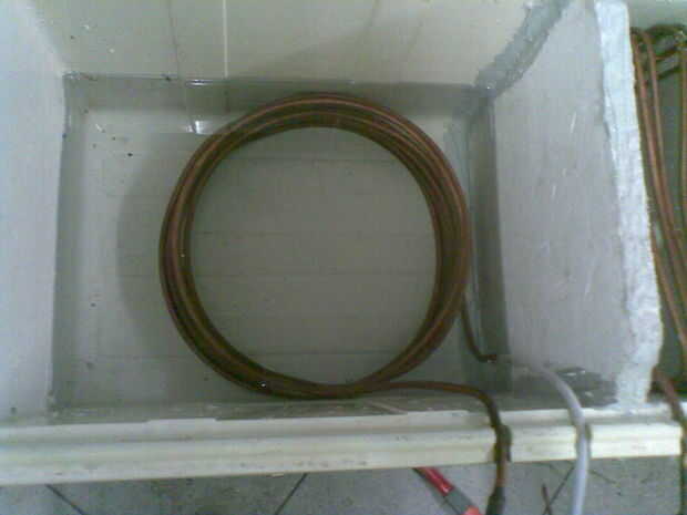 Las bobinas están sumergidas en el agua. La caja del refrigerador se ha dividido en dos partes.