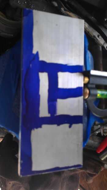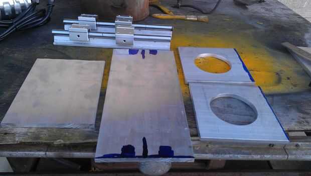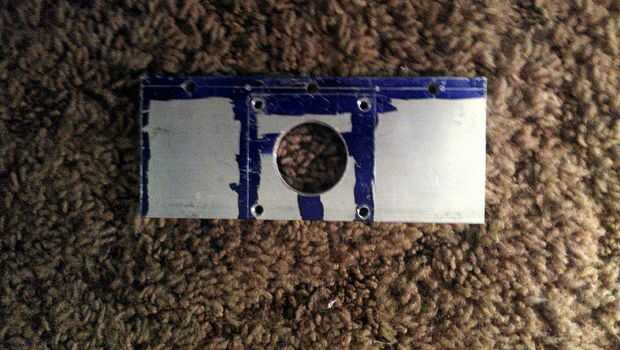 2,5 "x 6" placa superior de z. (Corte de la 2,5 "x 48" pieza.) 1" agujero taladrado. Nota que este orificio no está centrada en la placa. Gire el montaje del motor paso a paso hacia abajo y sujete en su lugar incluso con el centro de un borde largo (marca 3") a disposición de los agujeros. Ahora utilice la plantilla para marcar las ubicaciones de los 4 tornillos. Utilice el taladro #21 para los orificios piloto del grifo.