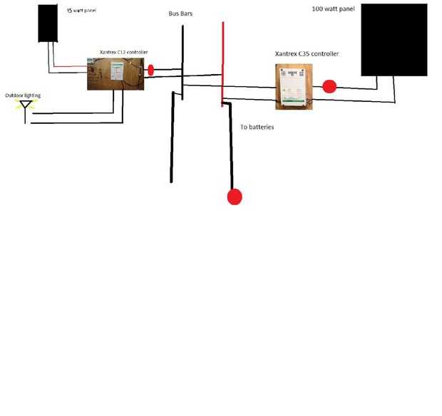 El panel de 15 vatios está conectado con el C12 y es la "fotocélula" para el control de la iluminación. Durante el día, sin embargo, regula la energía de la batería justo como cualquier otro controlador de carga. Por la noche, deja de enviar corriente a la batería y comienza haciendo justo lo contrario. El panel de 100 vatios (y cualquier futuro paneles) está conectado a la C35 debido a su mayor capacidad.