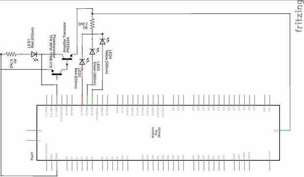 El fototransistor y el NPN transistor amplificador forma una especie de circuito de amplificador de par darlington. El LED rojo entre colector y PN2222A funciona como indicador cuando se reciben los códigos infrarrojos de transistor de la foto.