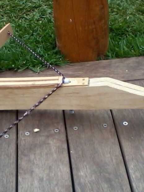 todo lo que necesita hacer ahora es construir el gatillo y sujete la cuerda a la prod. taladrar un agujero a medio camino entre la anchura de la madera detrás del canal de flecha nos permite deslizar un perno a través del orificio, con la cabeza del perno en la parte inferior lateral de la culata, ahora podemos Deslice una arandela sobre el extremo roscado del perno y apriete una tuerca en el perno. (pero no apretado, para que cuando se empuja la cabeza del perno plantea la arandela superior del canal de la flecha para que la cuerda puede deslizar y lanzar la flecha.) colocar la cuerda a la producción: perforar un agujero en el extremo de las dos longitudes de 500mm prod y atar una cuerda o una cadena en un agujero a otro, manteniendo una pequeña holgura en la cuerda para que no acople la madera prod.