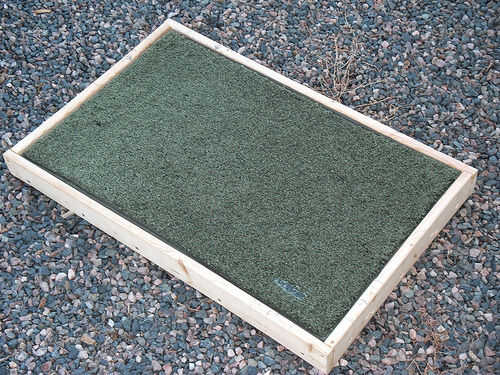 Fije la madera contrachapada interior marco con pegamento para madera y los tornillos de drywall de 1-3/8". Cuadro 8. Usando el pegamento o sujetadores de gancho y lazo si usted elige, coloque alfombra madera contrachapada.