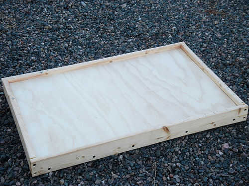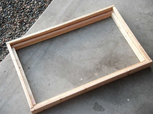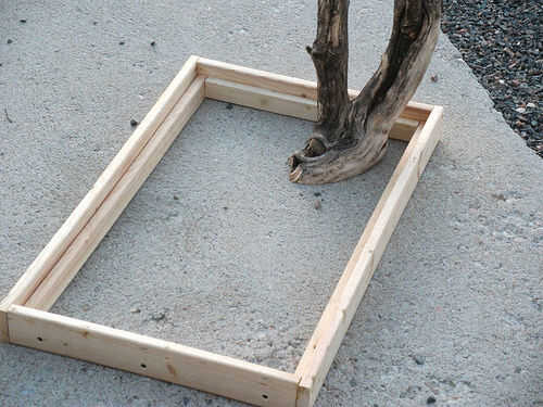 Usar los listones de enrasar de 1 "x 3" para la plataforma inferior. Cortar las tiras para que el interior serán dimensiones del marco de la 17 "x 27". 2 tiras de longitud son 28,5" de largo, y 2 para la anchura será 17" de largo. Fijar las tiras para que están parado en el borde para hacer el marco. Una plantilla de esquina de 90 grados es útil aquí, o utilice pinzas y una plaza de estructura para obtener la verdad de las esquinas. Me gusta usar pegamento para madera en las uniones de todos mis proyectos, y esto no es una excepción. Pretaladre y avellane los agujeros de sus tornillos. (Cuando se trabaja con furring strips es siempre recomendable pretaladrar los agujeros. Listones de split muy fáciles). Montar.