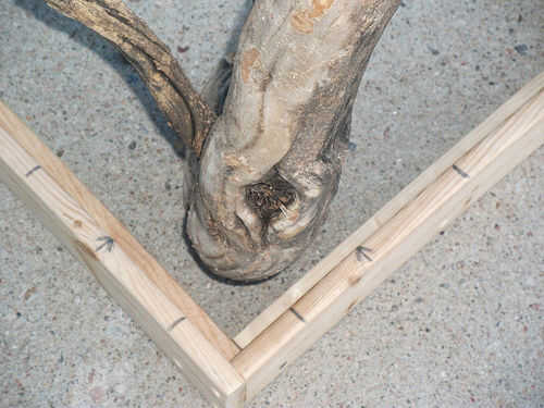 Coloque el árbol dentro del marco de la plataforma donde le gusta y marca el marco. Esto no es muy precisa, a menos que tenga un ojo láser como yo. ; P estas marcas son para darle una base como dónde colocar la tira de 2 "x 2" apoya el tronco dentro del marco. ver fotos 2 y 3. Después de tener la ubicación básica puede instalar los soportes de tronco. Dése suficiente área superficial para el maletero sujetar con tornillos largos corriendo aunque inferior para sujetar firmemente el tronco. Estoy agregando otro tira soporte de 2 "x 2" para una segunda parte. ver foto. 4 y 5.
