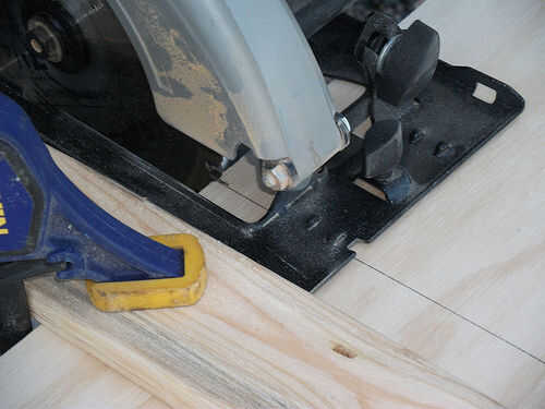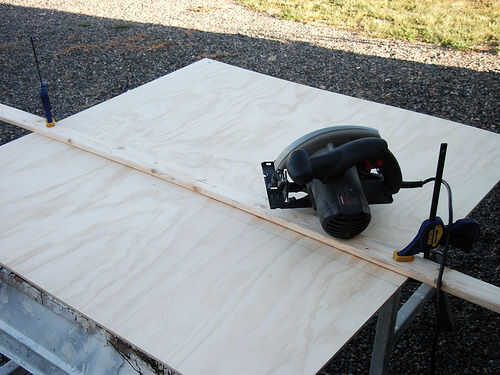 Medir el interior del marco para establecer las dimensiones del piso de madera contrachapada. Marcar la madera contrachapada y corte con una sierra de mesa. ** Punta. Si no tienes acceso a una sierra de mesa, un borde recto, un par de pinzas y Sierra trabajan en un sujetador. Sujete el borde recto a lo largo de la línea a cortar. Medir la base de la Sierra del borde de la hoja. Esta medida es hasta qué punto el lado del borde recto debe ser de línea. Fotos 6 y 7.