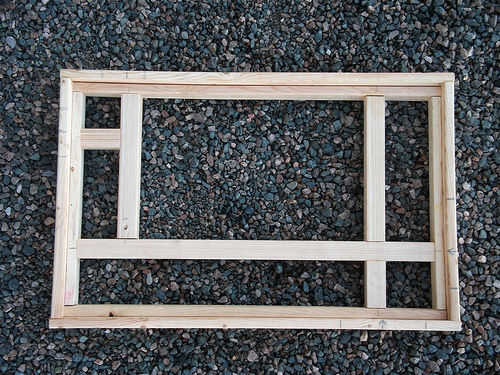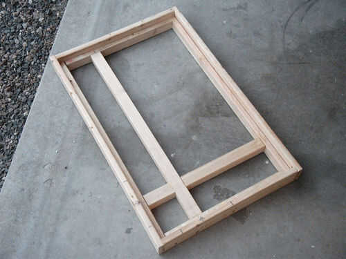 Ahora para apoyo interno, usted cortará el 1 "x 2" tiras para caber dentro de este marco. En este caso corté las tiras de longitud 27" de largo y las tiras de 2 ancho a 13.5" de largo. Coloque el marco sobre una superficie plana e Inserte el 1 "x 2" piezas dentro, borde plana contra la mesa así. Montar a la plataforma como se ve en la imagen 1.