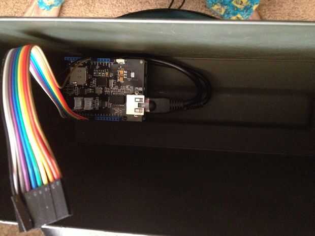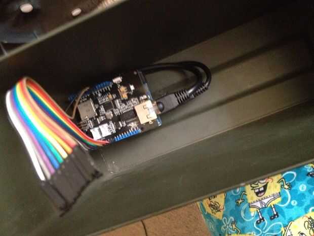 Así que ahora que tienes tu Arduino programado, tiene que montar, así como el módulo de relé. Elegí mi montar en la parte posterior de la lata para que pude lazo los cables Cat5 y USB por la parte trasera de la munición puede. Finalmente quiero incorporar control IR, por lo que eventualmente se atribuyo a un jack 1/8" que se conecta a un emisor de infrarrojos.