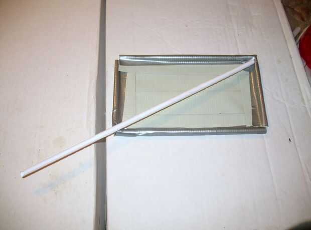 12. Coloque el tubo diagonal en el rectángulo con la punta plana dentro de la esquina, donde está doblado el tubo envuelto. Marca en el otro extremo se encuentra en la esquina opuesta y corte plano. Quieres meter este tubo dentro del rectángulo de esquina doblada a la esquina doblada. Esto le dará el soporte inferior.