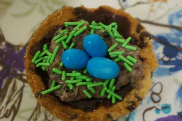 Moldear la masa para galletas en forma de un nido en mi mano y coloque el nido en el centro de la galleta, luego decoré con sprinkles y huevos de caramelo.