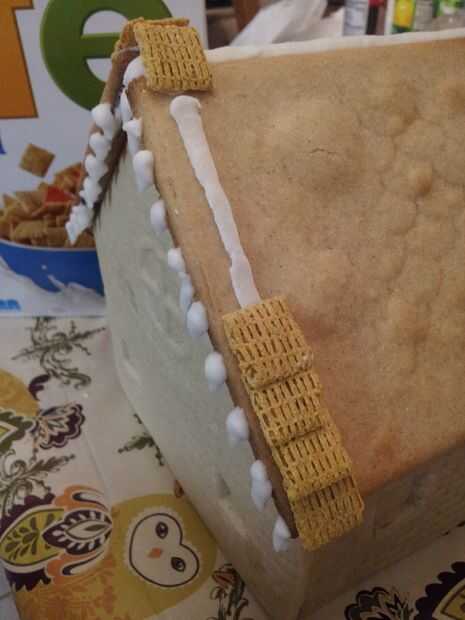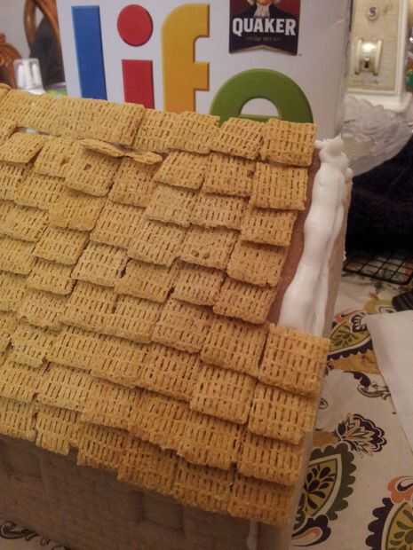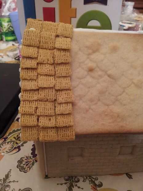 Para hacer las tejas, simplemente una línea de formación de hielo real de tuberías cuidadosamente organizar y coloque el cereal de la vida. Posteriormente se espolvorea azúcar en polvo sobre ellos para ver como nevaba.