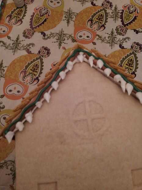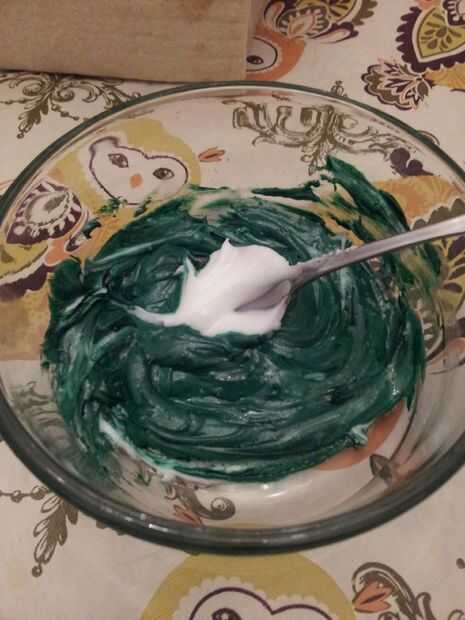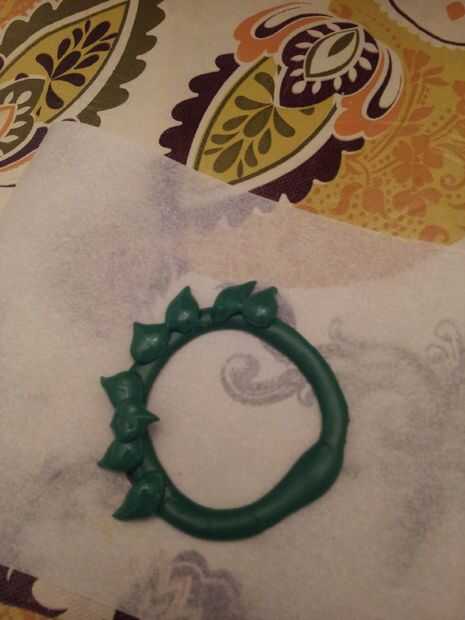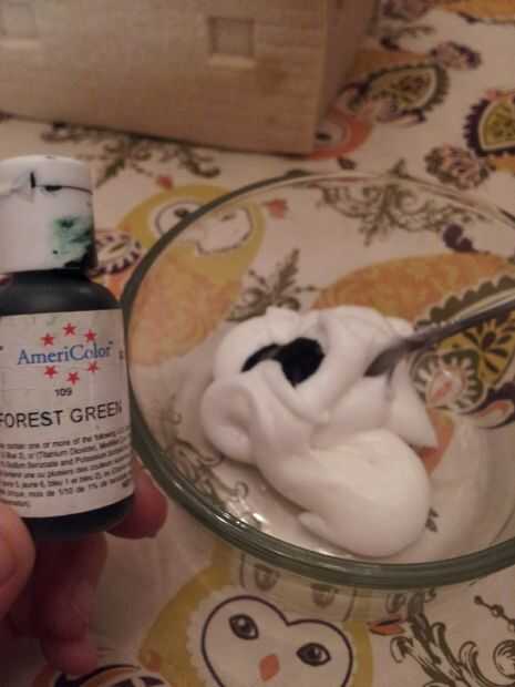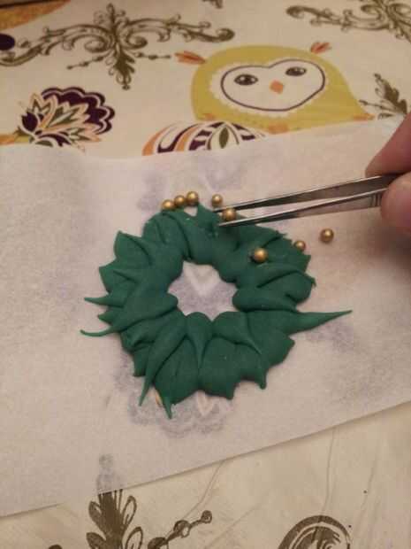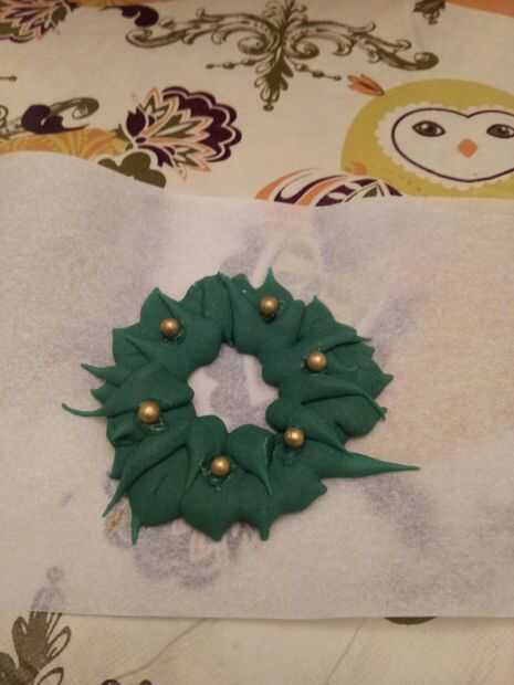 Mientras tanto usted puede trabajar en su corona. Dibuja un círculo del tamaño que desee en un pedazo de papel. Poner un trozo pequeño de papel de cera sobre él y un círculo de la pipa. Entonces utilice la punta de la hoja y exprimir y dejar ir, exprimir y dejar ir qué tipo de miradas como las hojas. Que todo el círculo hasta que tiene una corona. Si quieres poner algunas grageas o algún tipo de caramelo, ahora sería el momento. O puede hacer lo que hice y agregarlos después de que la corona es seca con un poquito de gel de tubo.