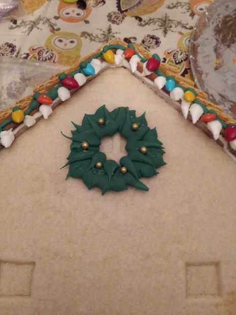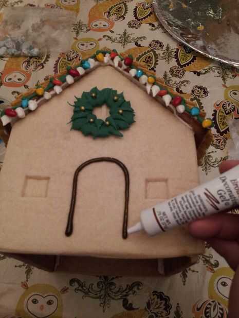 Utilice cualquier color piping gel o royal icing para esbozar la puerta. Yo utiliza gel de tubería marrón y adjunta un poco draggee / azúcar perla para el pomo de la puerta.