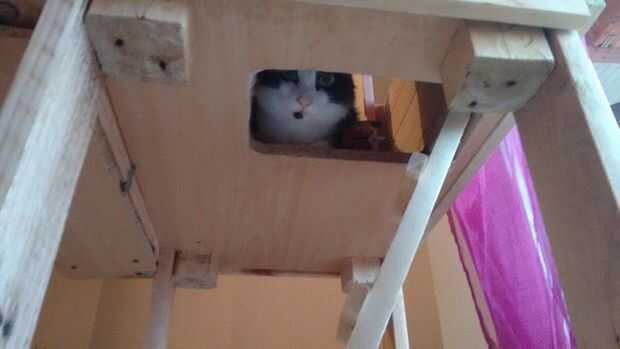 Luego atornilló las "paredes" de la casa y corté un agujero (de 15x25cm) para dejar que el gato entra en la casa.