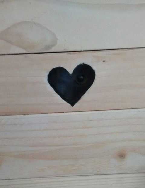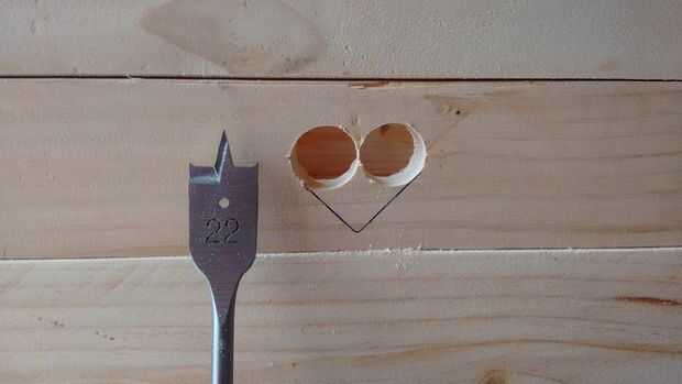 Para crear un en forma de corazón de mirilla, perforé dos agujeros de 22mm de lado a lado y terminar la forma del corazón con una sierra de calar.