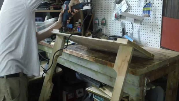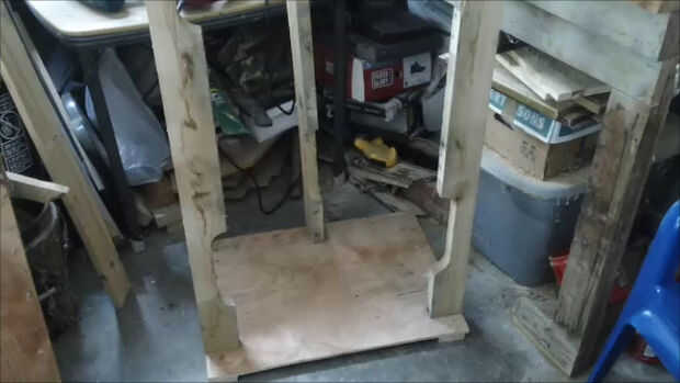 A continuación tomar las vigas cruzadas de la plataforma, pararse en un triángulo y coloque la madera contrachapada en la parte superior. Entonces puso un par de tornillos en cada viga para sostener todo junto. Ahora usted puede Dale la vuelta y ya tienes la estructura básica.