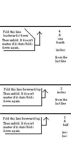 ¡ Prepárate para algunos pliegues. Siga el cuadro. Si todavía no comprendes que estaremos encantado de ayudarle, como dejar un mensaje en mi cuenta y me dicen específicamente cuál es el problema, en lugar de simplemente decir, no funciona. Lo mismo para cada media hoja. El cuadro representa una mitad hoja. Doblar en todas las líneas, pero medir primero.