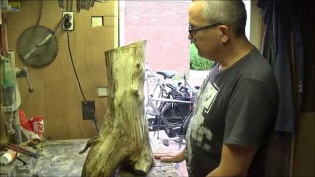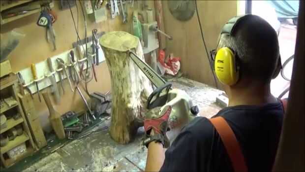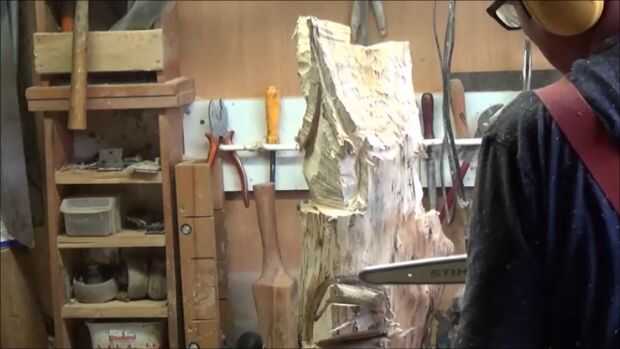 Después de hecho un plan áspero, empecé con drawin líneas con la punta de mi motosierra. Y siguió cortando el techo tallado y el también el resto del edificio.