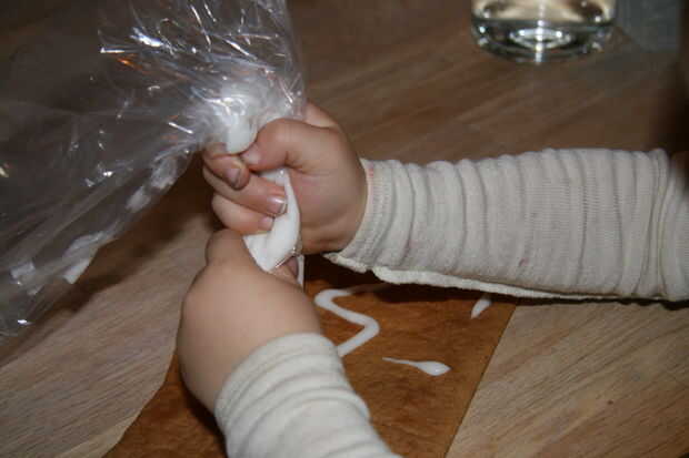 Yo uso una cuchara y completar la formación de hielo en bolsas de plástico de pan. Entonces yo cortar un pequeño agujero en una esquina, así que es fácil exprimir la guinda. A continuación, sólo tiene que añadir caramelo! Dejarlo endurecer durante la noche, y había montado la mañana después.