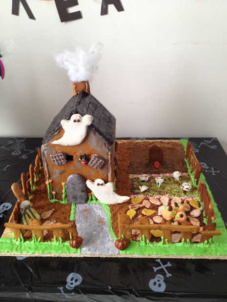 Esta casa embrujada definitivamente es comestible y sabor maravilloso como yo uso mi ir a la receta. Sin embargo, puesto que esto es para la decoración de la mesa, no cubre mi tablero con papel de aluminio papel/pasteles/pastel. Si desea devorar a su casa de pan de jengibre al final, cubrir la placa para que las galletas no toquen la placa :)