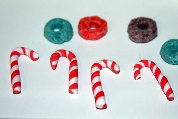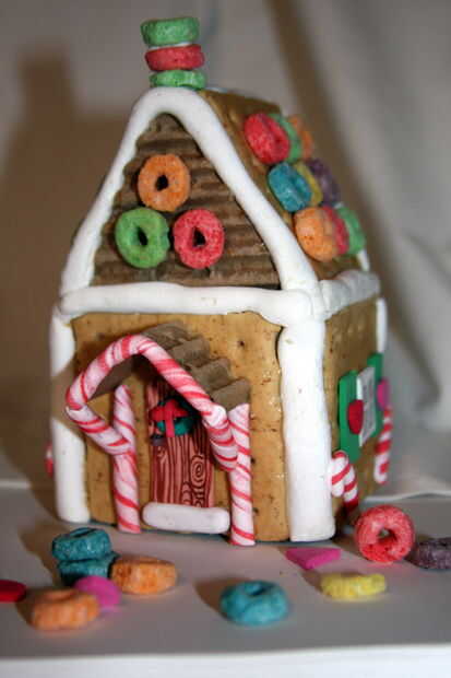 Usé el fruit loops o cheerios para otra decoración. Otra vez, tradicionalmente se utiliza caramelo, gumdrops y similares. Pero como esto iba a ser trabajado encendido por una clase de estudiantes en el transcurso de una semana, usaba arcilla y elementos que se podían adquirir barato.