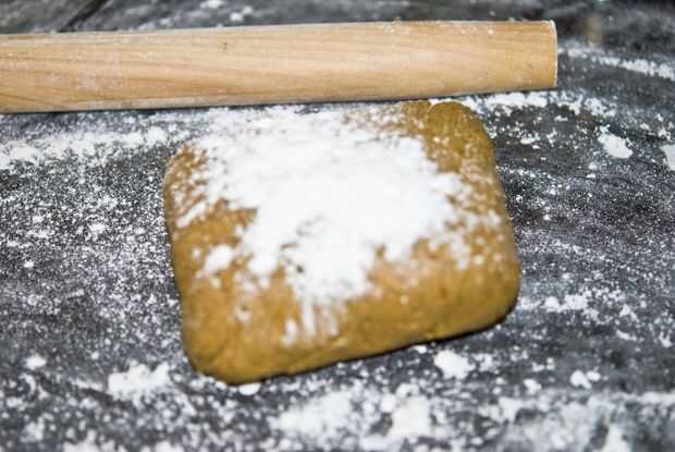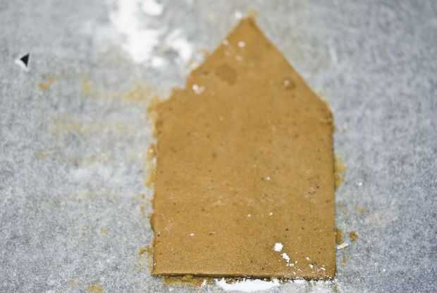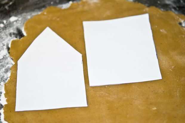 Estirar la masa en un círculo grueso de 1/4 de pulgada. Coloque el modelo de casa encima de la masa y cortar las diferentes formas.