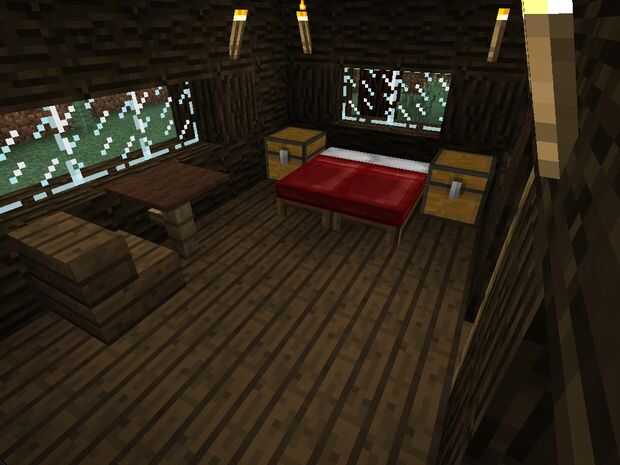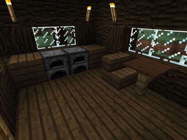 Por un lado poner dos hornos en los tablones de madera y mediados cada lado, en el otro extremo pone dos camas en el medio y el pecho de cada lado, y finalmente poner una cerca junto al lado de la pared, poner una alfombra en la parte superior, pone una silla cualquiera de los lados, poner una reja en el lado de la silla.