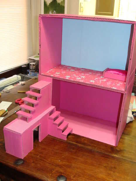 Ahora pintar tu casa de muñecas y escaleras. Usé una pintura en aerosol porque no creo que deforman el cartón tanto.