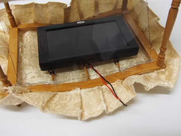 Con la cama aún boca abajo y con un montón de pegamento, pegar la pantalla de cristal en su lugar. He utilizado pegamento caliente pero debería funcionar cualquier pegamento fuerte.