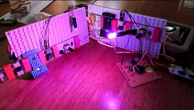 Bienvenido a la "casa de oscilación". Cuando usted se mueve alrededor dentro de la casa, controlable RGB de led cambio sintetizador y color bits hacen ruidos escalofriantes. Es todo muy inquietante y divertido! La casa tiene dos paredes, de los cuales disponen de un oscilador, un sensor de proximidad y controlable RGB led. Los dos osciladores combinan sonidos en un poco de la mezcla. Añadir más bits sintetizador para más efectos de sonido.