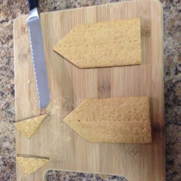 Romper una de las galletas por la mitad a lo largo de la perforación. Con dos de las otras galletas cortadas la parte superior de un punto utilizando un cuchillo de sierra con un movimiento de "Sierra".