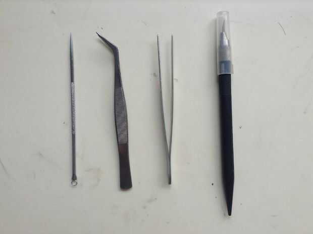 Tesis son prácticamente todas las herramientas que necesita. Dentro de todas estas herramientas, sólo el cortador de la pluma es realmente necesario. Puede olvidar el fórceps si crees que tienes las manos bien y puede tirar la barra de metal al azar y reemplazarlo con un palillo de dientes.
