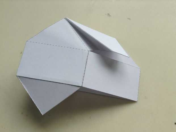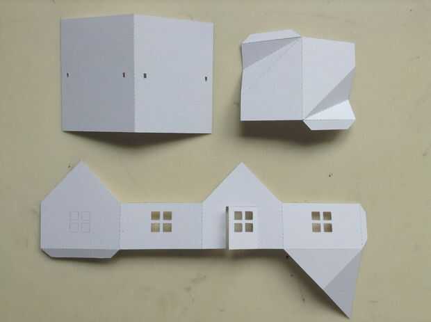 Una casa ficticia muestra cómo se conecta la capa más baja del techo a la pared de la casa, así como la casa es aplanada. El techo superior que falta va pegado sobre la región plana trapezoidal del bajo techo más adelante pero, no lo hacen ahora como todavía necesitamos hacer algunas conexiones de circuitos en los tejados primero.