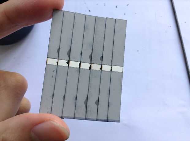 Para conectar las células solares en serie, conectar sucesivamente la parte inferior de una celda a la parte superior de la otra. Las células solares no son un bueno conductor. Para facilitar el flujo de corriente, barra de distribución, la región más conductor blanco la célula solar, se imprime en las células. Por esta razón puedes ver que solo estoy aplicando la tinta conductiva en la barra de bus. Después de aplicar 2 puntos de pegamento instantáneo en el borde de la célula y un punto de tinta conductora sobre el borde de la barra, coloqué la segunda célula solar en la primera con una superposición de 1mm. Repetir esto por 5 veces más y obtendrá un panel consiste en 7 células. Tenga en cuenta que cuanto más usted se superponen, menos de la célula se exposición a la luz solar y así menos actual se puede obtener de la celda.