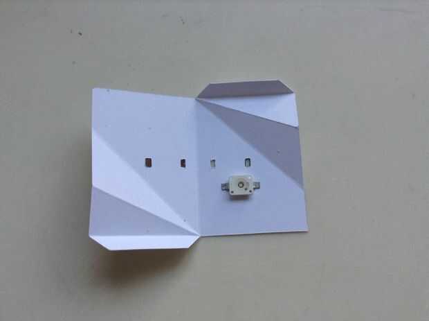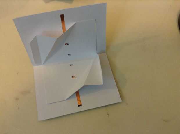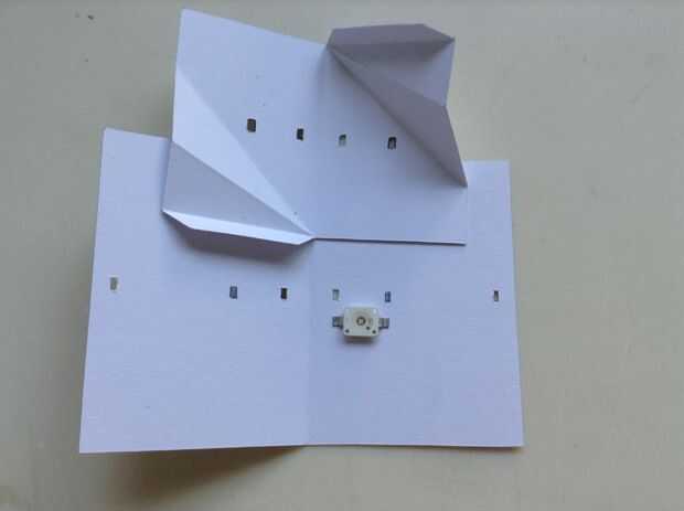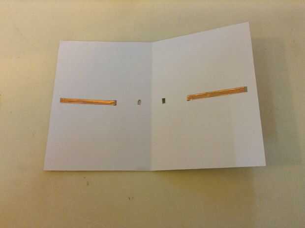 Ahora vamos a cortar los agujeros en la capa superior de la cubierta. Los agujeros cerca de la línea de doblez central deberán alinearse mejor con los de la capa interna para facilitar la conexión. Esos agujeros se deriva de la línea de doblez de centro para un poco por el grosor del papel. Continuación, utilice el panel solar en el último paso para medir la separación entre los dos agujeros en la capa superior de la cubierta. Los agujeros serán directamente debajo de la primera y la última célula solar. En la foto adjunta, se puede ver que existe una región sombreada entre los 2 orificios en un lado de la cubierta superior. La región sombreada corresponde al segundo agujero de la capa más baja. Luego puede cortar una tira de cinta de cobre de unos 2-3 mm de ancho y conecta los orificios a los lados y en las regiones sombreadas como se muestra en la foto. Esto luego se puede pegar en el techo más bajo con algun pegamento al azar. Pegamento instantáneo hará igual de bien pero pegamento de emer ciertamente hará un mejor trabajo.