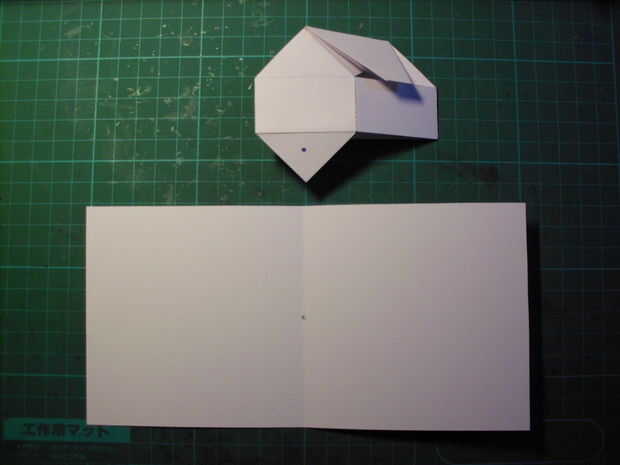 Básicamente, todo lo que necesitas es un papel de respaldo grueso de alrededor de 20 cm x 10 cm, con una línea de pliegue en el centro y pequeña marca justo en el centro. A continuación, aplique el pegamento de Elmer a la parte posterior del triángulo (marcado con un punto azul) y alinee el borde de ese triángulo al punto central de la base como se muestra en la foto. A continuación, Aplique pegamento en el triángulo superior y cerrar el respaldo. Antes de que el pegamento se seque completamente, trate de abrir el papel del forro para ver si la casa se abre bien. Puede que necesite ajustar tan un poco debido al grosor del papel.