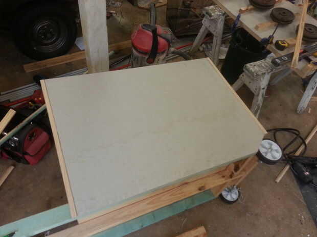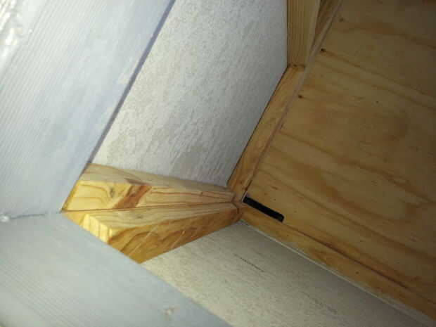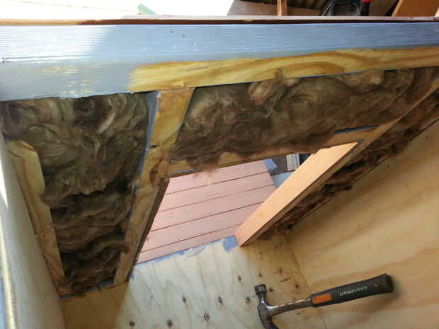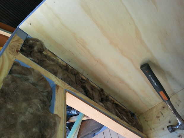 Ahora que el exterior es revestido el material aislante se puede poner. Sólo cogí lo más barato que pude encontrar (lana de la tierra) que no era fibra vidrio murciélagos (quería evitar por lo irritante, picazón puede ser). Cuando se rellena en las paredes había forrado el interior con el capas de 3mm y había clavado y pegado todo junto. El techo tiene algunas molduras de pino en la parte superior para tratar de proporcionar una ruta para cualquier agua que fluya a lo largo en vez de en bajo la tapa y conseguir mi mojado de perro en la perrera.