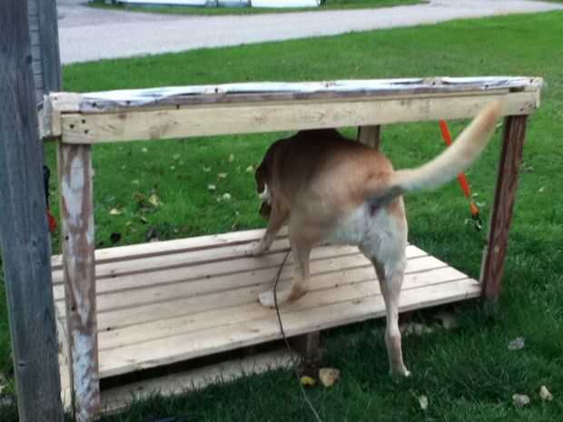 Construí esta para el sobrino de mi esposa a casa de sus dos perros de caza hembra bastante grande.Tiene dos puertas 2'x 3' con una partición en el centro.Cada perro tiene una zona separada de 4'x 6'.Lata acanalada fue utilizada para el techo y las p