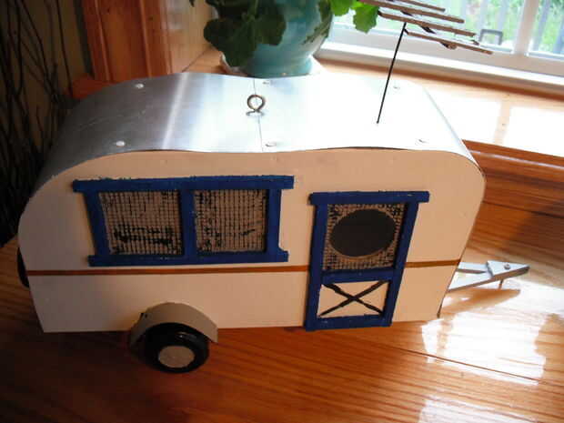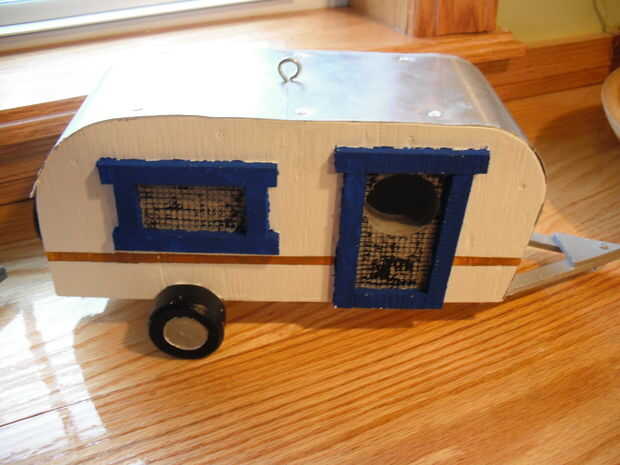 Para iniciar la pintura cubrí la casa del pájaro todo, menos el techo, con pintura exterior blanca. Acabé con dos capas de pintura blanca. La pintura de detalle fue acabada con pintura acrílica y un montón de pacientes. Si alguna vez hago más de estos que estaré seguro llegar a un mejor esquema de pintura, el azul es un poco "brillante". También haría que la parte inferior tenía más espacio para que después pinté estaría todavía capaces de quitarla; los fondos actuales son como cuña en su lugar. Tengo que ver si el tiempo todavía delaminate la madera contrachapada, incluso después de que cubren los extremos con techos intermitente, que podría haber sido un mejor ideal para usar tablas de pino pero la madera no era el cajón de la chatarra de hay pérdida real.