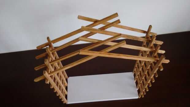 Sujete ambos extremos de cada cruz a los lados interiores de los extremos superiores de ambas mallas. Deje un margen en los extremos de cada cruz. La idea es crear una choza como estructura.