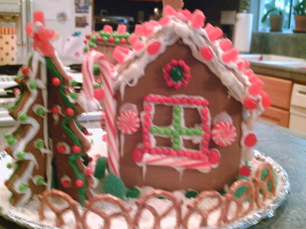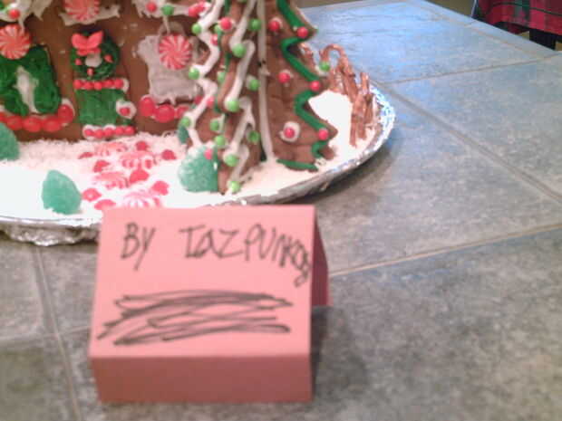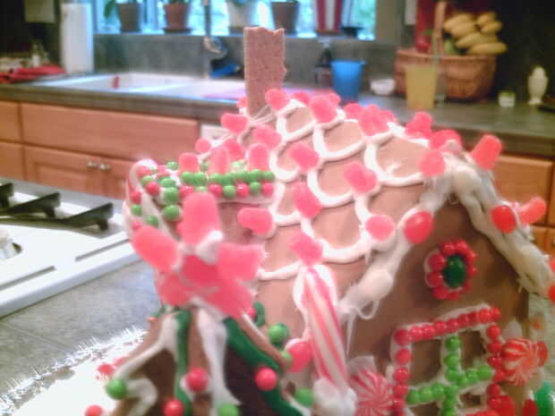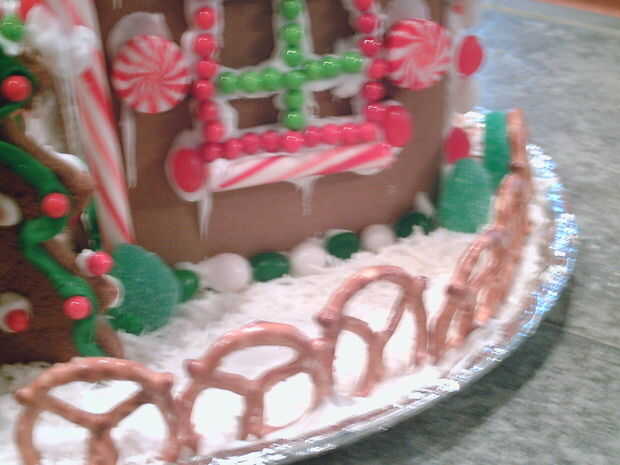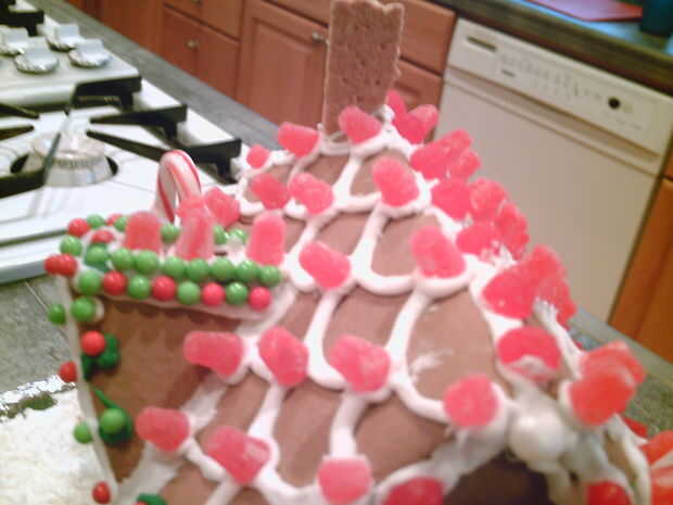 el techo se compone de chocolate con leche oscuro, así como círculos de chocolate blanco. Han sido capas para dar el aspecto de "Tejas". La guía se compone de grandes bayas suecas y naranja Mike & Ike. También hay varios tipos de dulces, inc