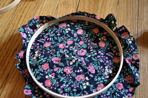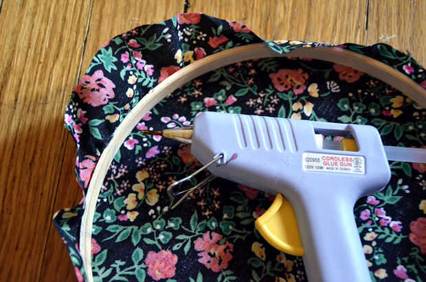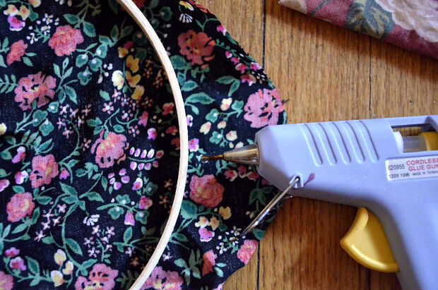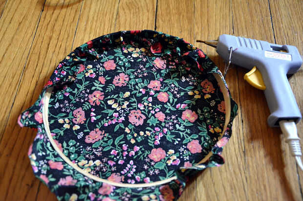 2. una vez que estés a mitad de camino alrededor, mantener pegado, pero esta vez tire de la tela pulsa en el pegamento. Desea que el tejido sea apretado en el círculo. Esto será sacar las arrugas.
