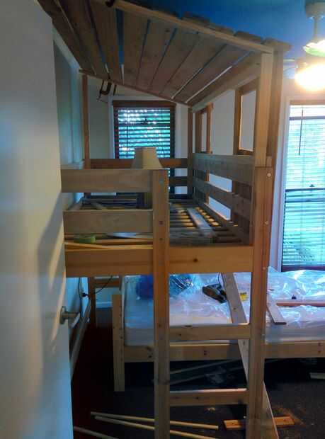 Una consideración que hicimos fue la posibilidad de utilizar la litera de arriba como un repuesto de un día. Los listones en la pared lateral se unen como un solo panel desmontable, que puede se desatrancó y quitarlo para permitir que un colchón en.
