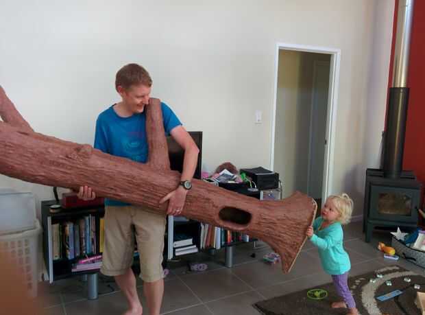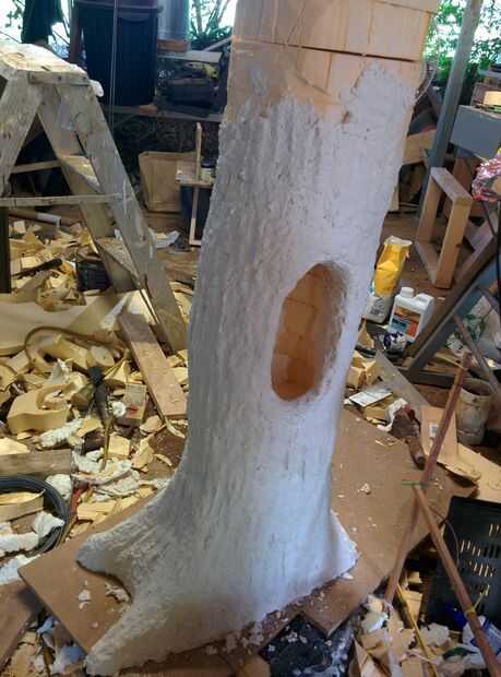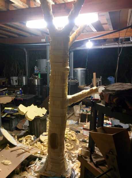 Hice el árbol falso de muchas capas de poliestireno expandido, recubierto con una piel de arcilla de papel. Corte cada capa usando un cortador de alambre caliente DIY (compró algún alambre de nicrom bunnings y atado a un 12v coche batería ver http://www.jacobs-online.biz/nichrome/NichromeCalc... para los cálculos).