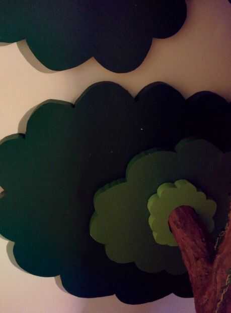 Opté por simplicidad para las hojas y cortar grande ' canopy; formas de las hojas grandes de poliestireno. Yo corte una mezcla de formas de hojas gruesas de 20, 30 y 40 mm y había pintado cada capa en un tono diferente de verde. Enrosca cada capa directamente hasta el techo (pensé que esto sería más fácil de parche de pegamento cuando nos decidimos a llevarlo todo hacia abajo). Entonces pegué otra capa encima para ocultar los agujeros de tornillo. He hecho collares a recorrer algunas de las ramas de los árboles como algunos de ellos que demasiado corta.