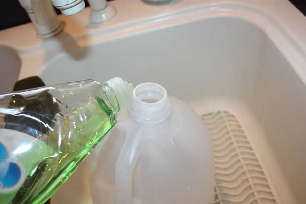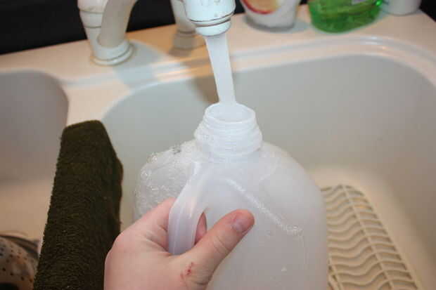 Limpie el cartón de leche con el agua tibia y jabón de plato.